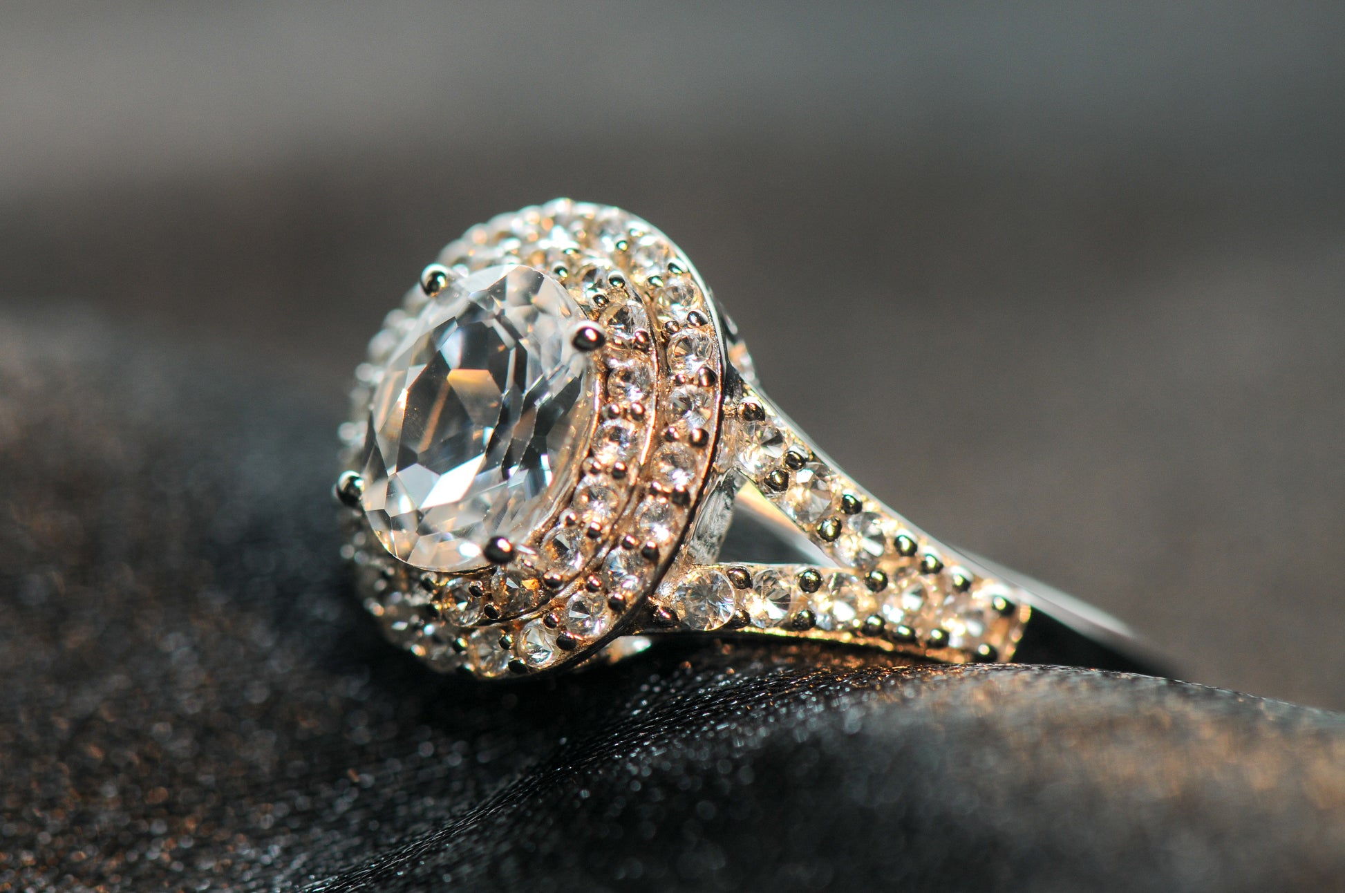 Expertly crafted with a classic oval setting, this ring features a sparkling halo of cubic zirconia stones surrounding the center. Made of sterling silver, the circular stones add a touch of elegance. A timeless piece that adds sophistication to any outfit.