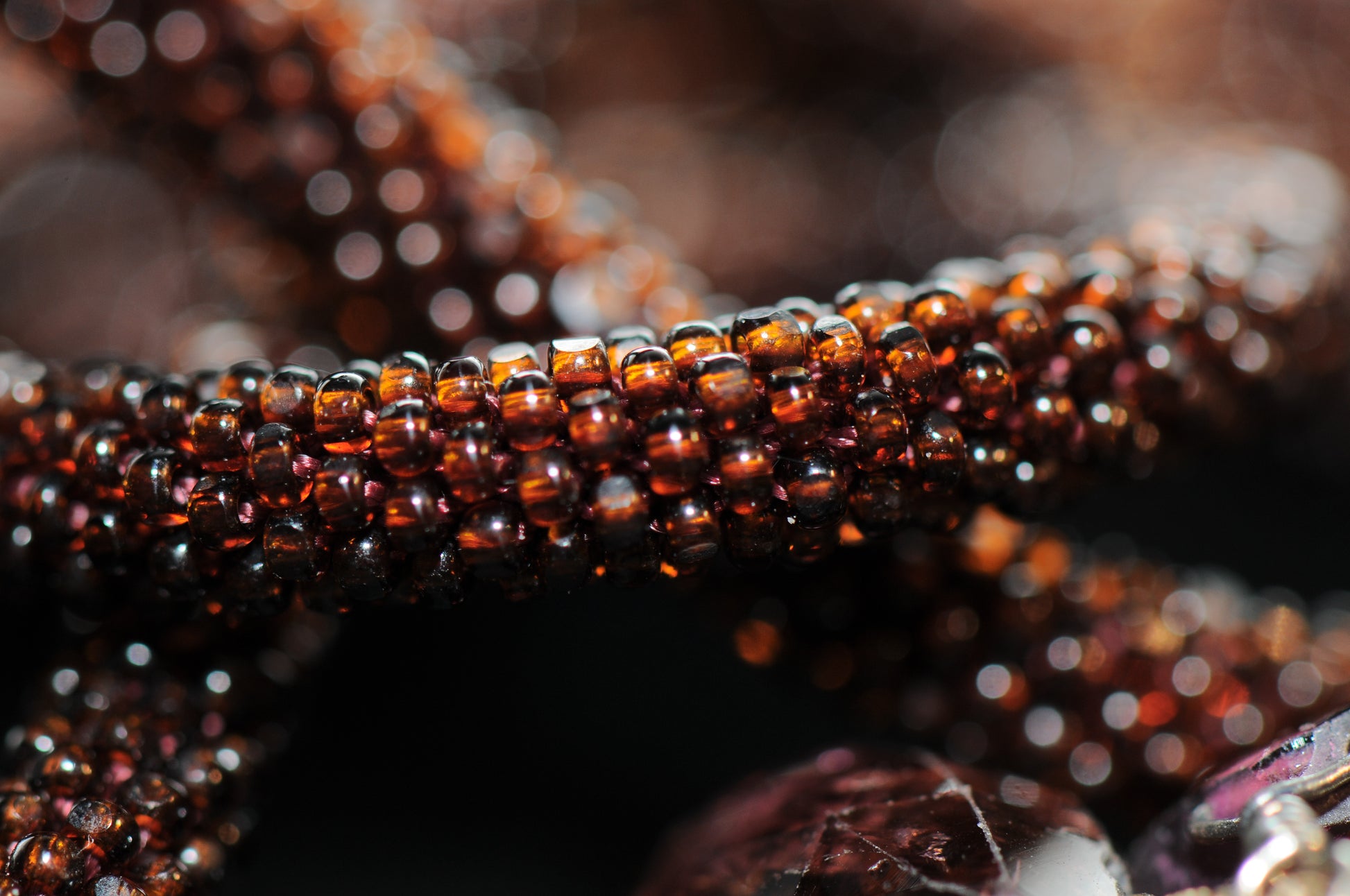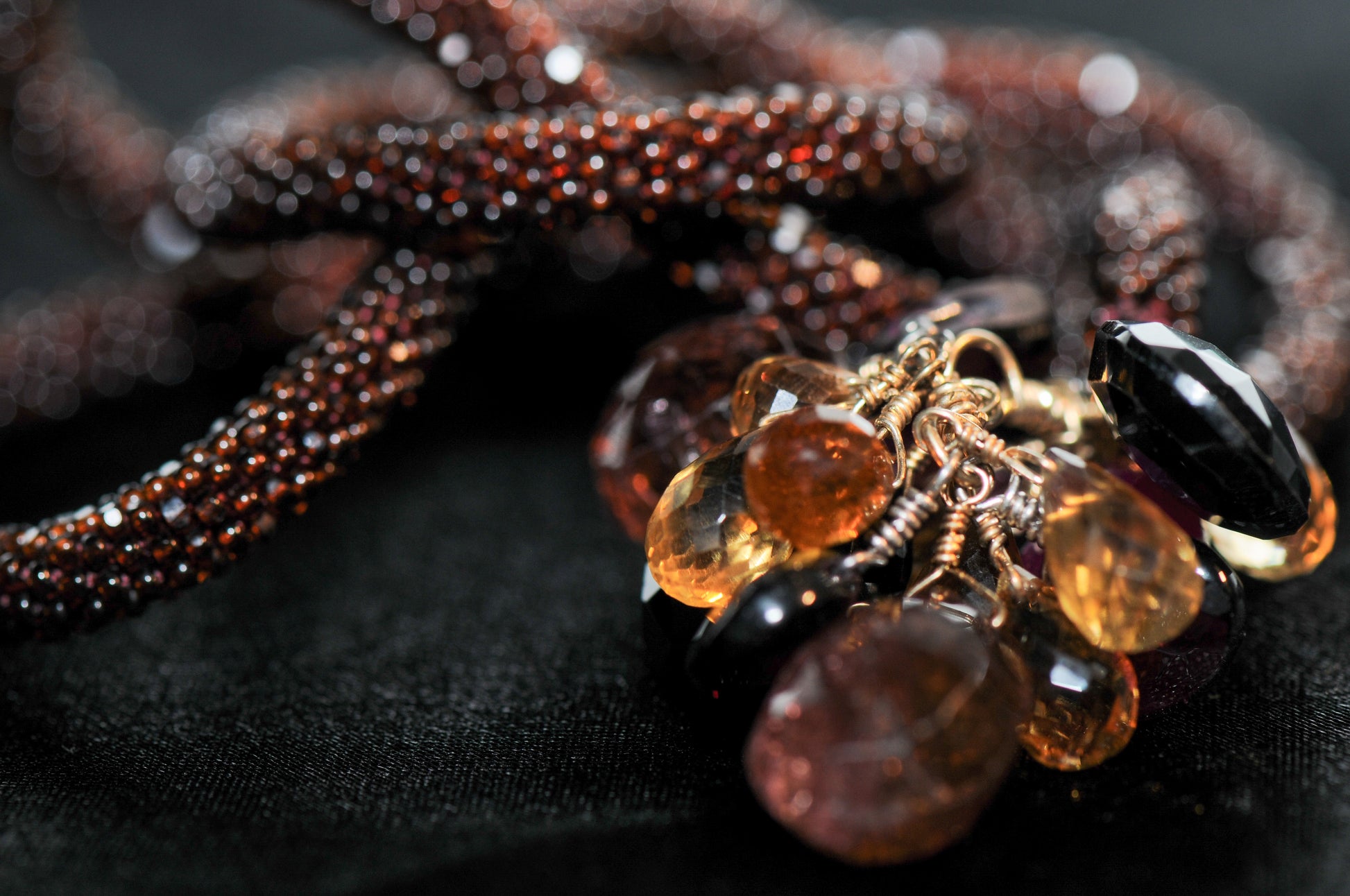 This professionally crafted crochet necklace features a stunning center piece of cetrine, ruby, and turmoline stones, accentuated by gold plated wiring. Hand worked with intricate beading, this necklace offers a unique and sophisticated touch to any outfit. Experience the benefits of high quality materials and expert craftsmanship with this beautiful piece.