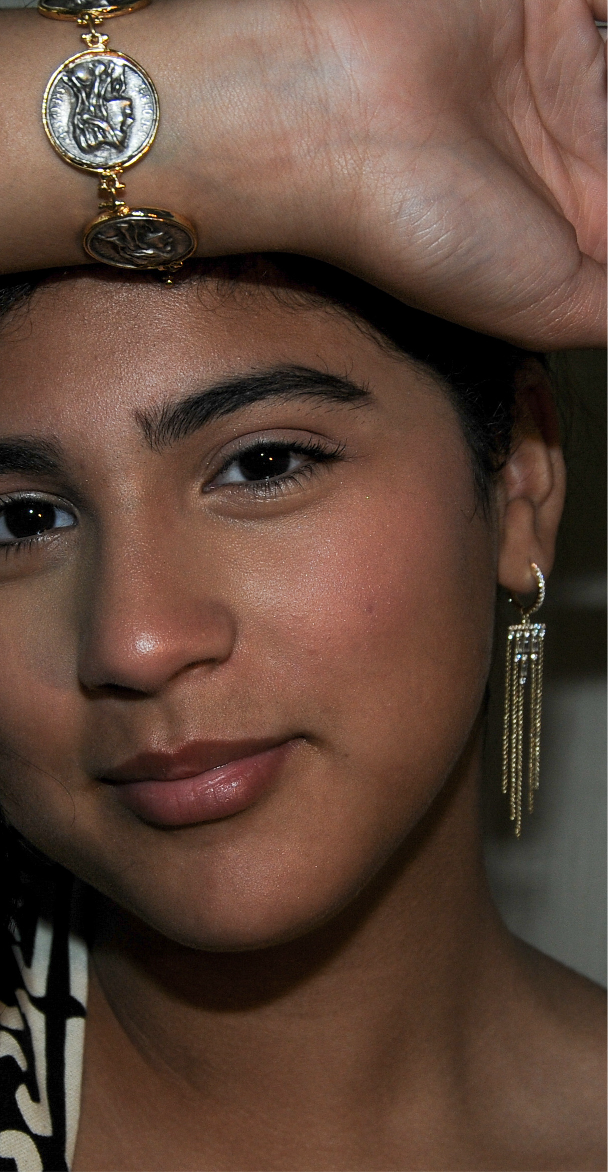 These are elegant gold plated earrings featuring a hoop at the lobe, adorned with small, sparkling stones. From the hoop, delicate gold chains dangle down, creating a chandelier effect. The chains are interspersed with rectangular and round-cut stones that add an extra touch of sparkle, giving the earrings a sophisticated and eye-catching appearance. Perfect for adding a touch of glamour to any outfit.
