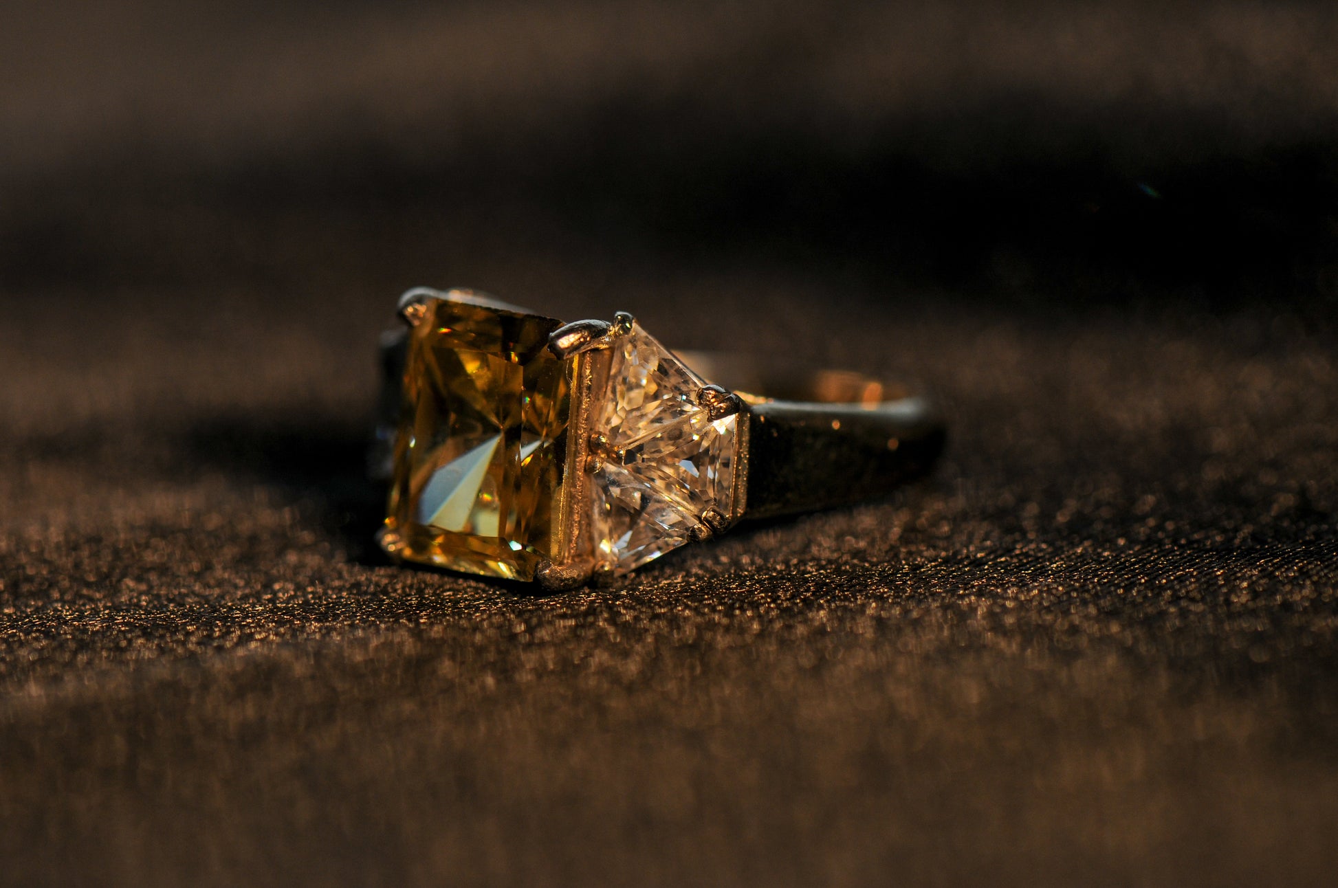 A striking yellow stone center, radiant-cut yellow cubic zirconia. The central stone is rectangular with sharp facets that catch and reflect light beautifully, giving it a bright, fiery glow. It is flanked on either side by two triangular clear stones. Sterling silver setting provides a sleek and elegant contrast to the warm yellow hue of the main stone. This design is classic, sophisticated, and eye-catching, perfect for someone seeking a bold and luxurious piece of jewelry.