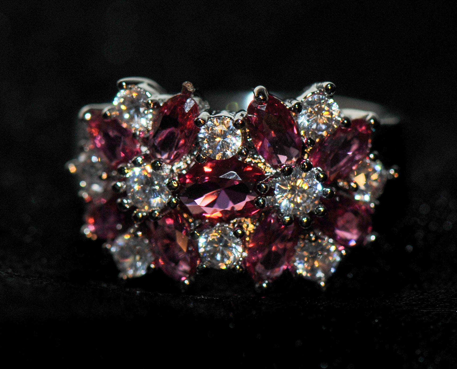 Expertly crafted, this Pink Forever Flower Ring features a stunning mix of petal and circular stones, along with square cubic zirconia for a sparkling effect. The delicate pink petals and intricate flower design are set in sterling silver, making it a timeless and elegant piece for any occasion.