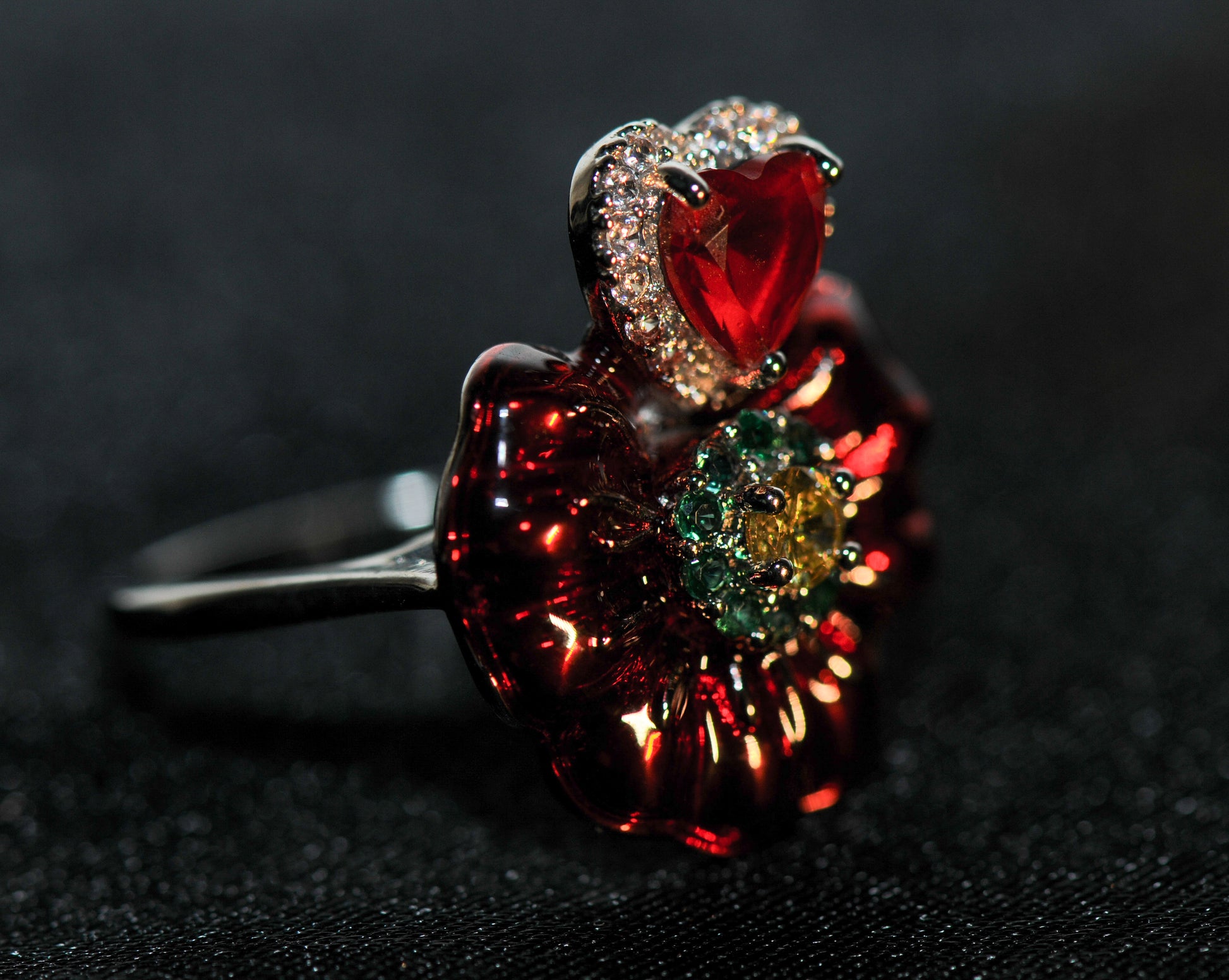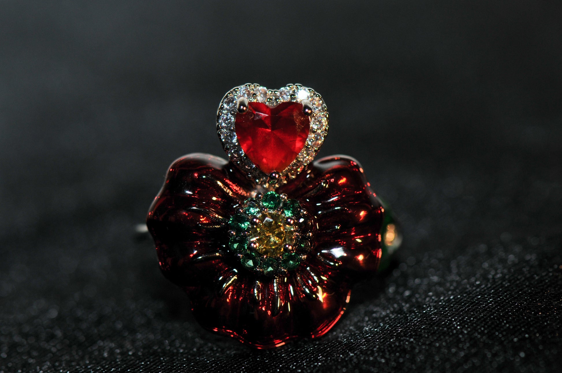This exquisite Queen of Hearts Ring is expertly crafted from sterling silver and features a stunning red flower with a vibrant green Yellowstone center. A brilliant red heart adorned with sparkling cubic zirconia stones completes this gorgeous design. Add a touch of elegance and romance to any outfit with this captivating ring.