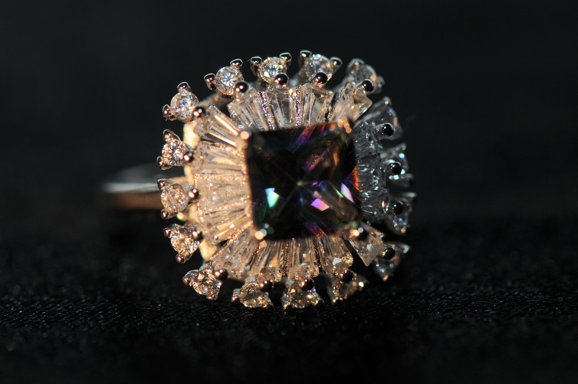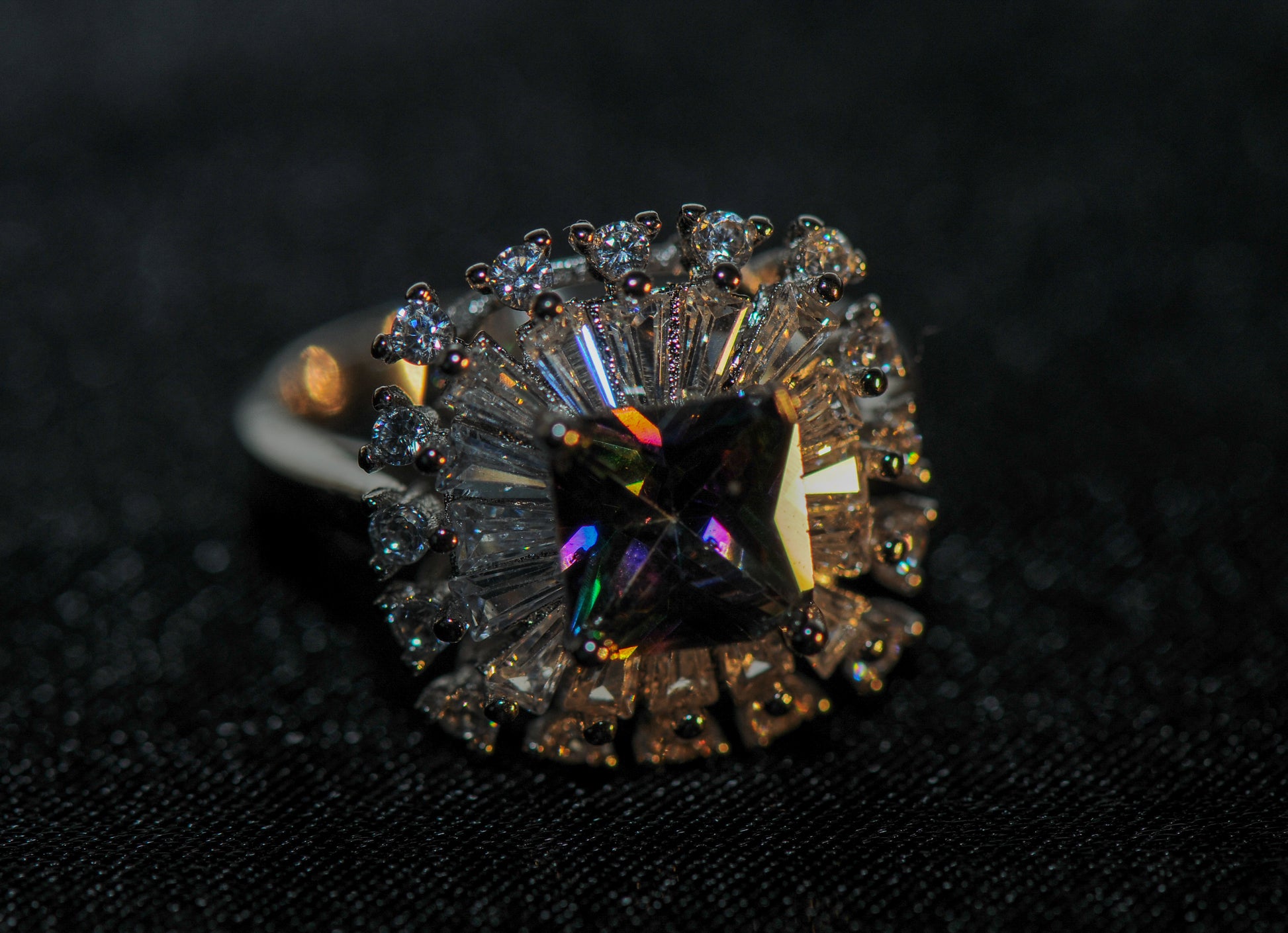 This is a dazzling cocktail ring featuring a striking square-cut mystic topaz at its center, displaying a mesmerizing array of colors. Surrounding the central stone is an intricate halo of baguette and round-cut clear stones, arranged in a sunburst pattern, which amplifies the ring's brilliance. The combination of the multi-colored mystic topaz and the sparkling halo creates a luxurious and opulent look, making this ring a show-stopping piece perfect for special occasions. The sterling silver setting adds to its elegance, providing a sturdy yet refined base for the elaborate design.