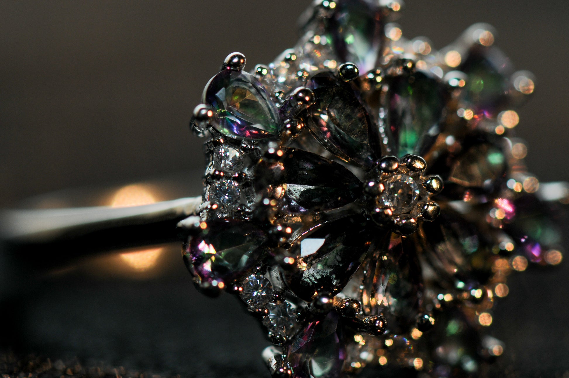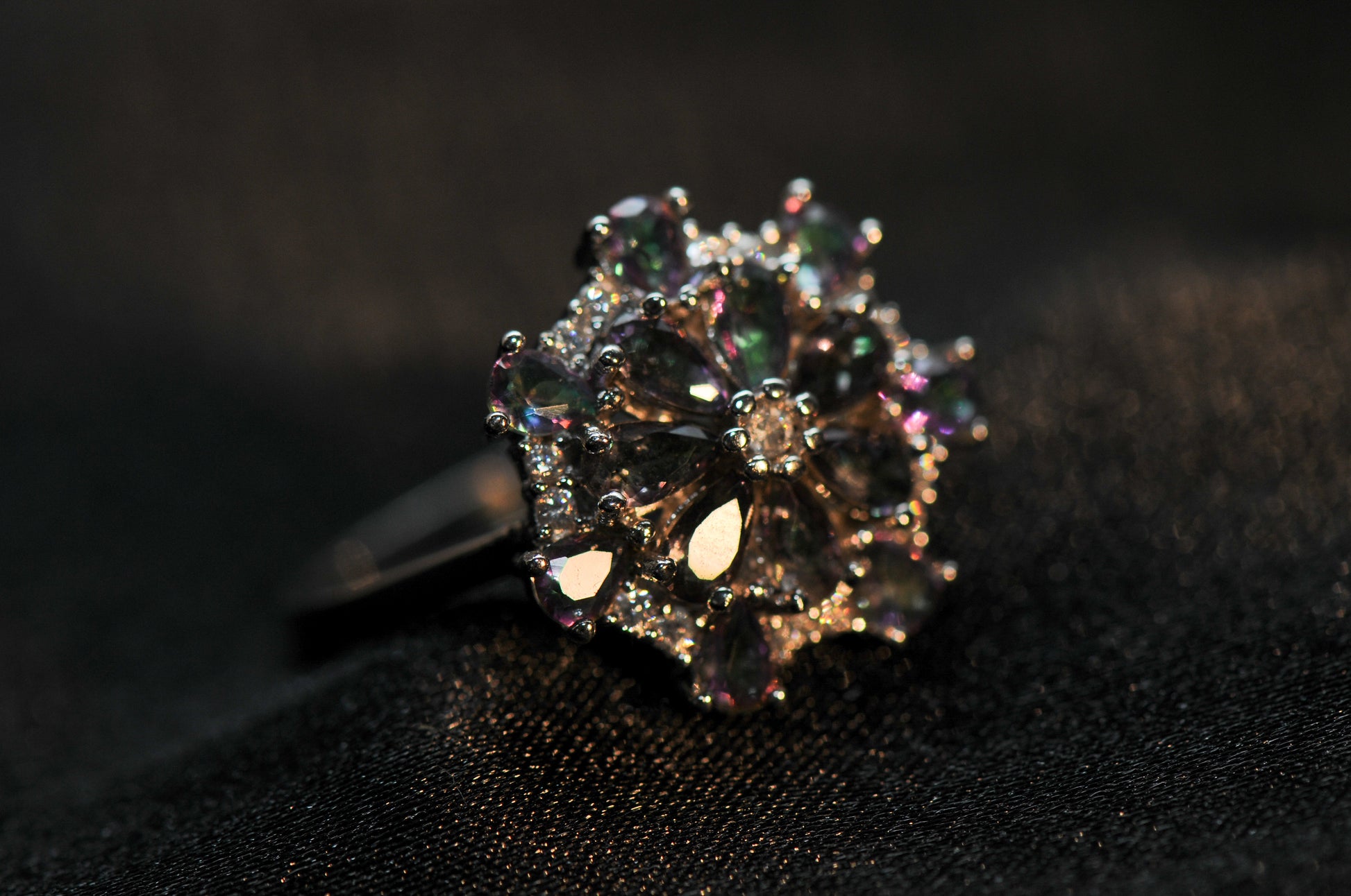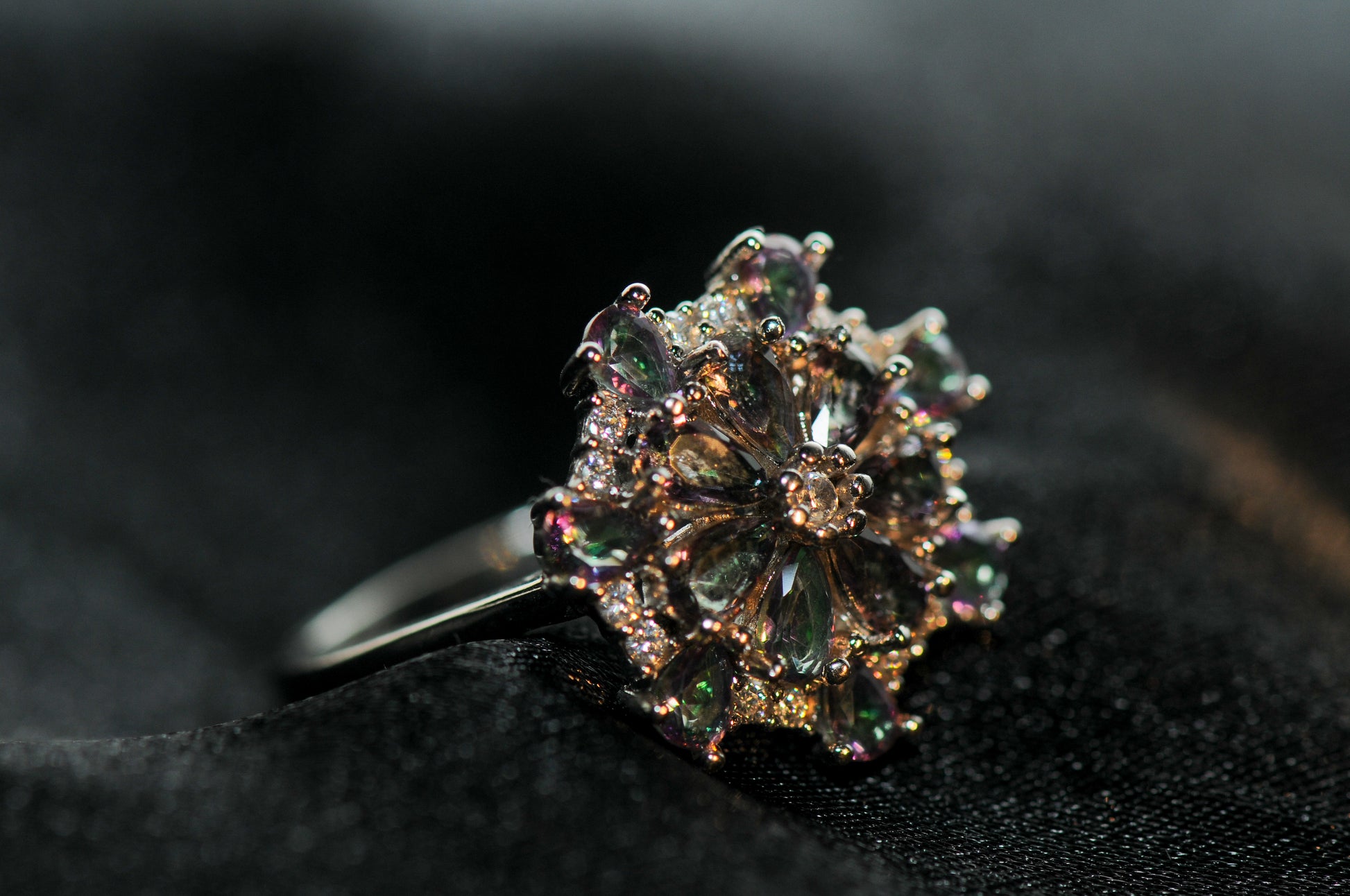 Crafted with sterling silver and adorned with vibrant grey iridescent stones and sparkling cubic zirconia, the Sun Ray Mystic Ring boasts a unique sunray-inspired structure. Add a touch of elegance and natural beauty to any outfit with this exquisite piece.