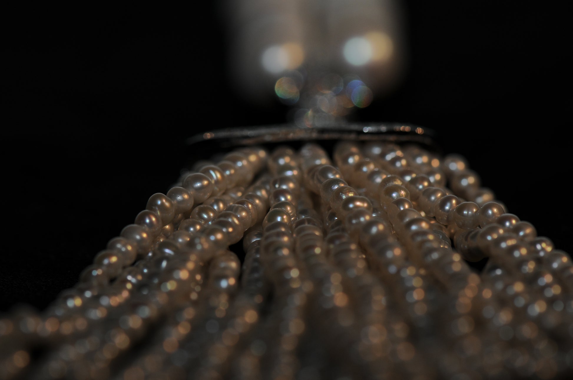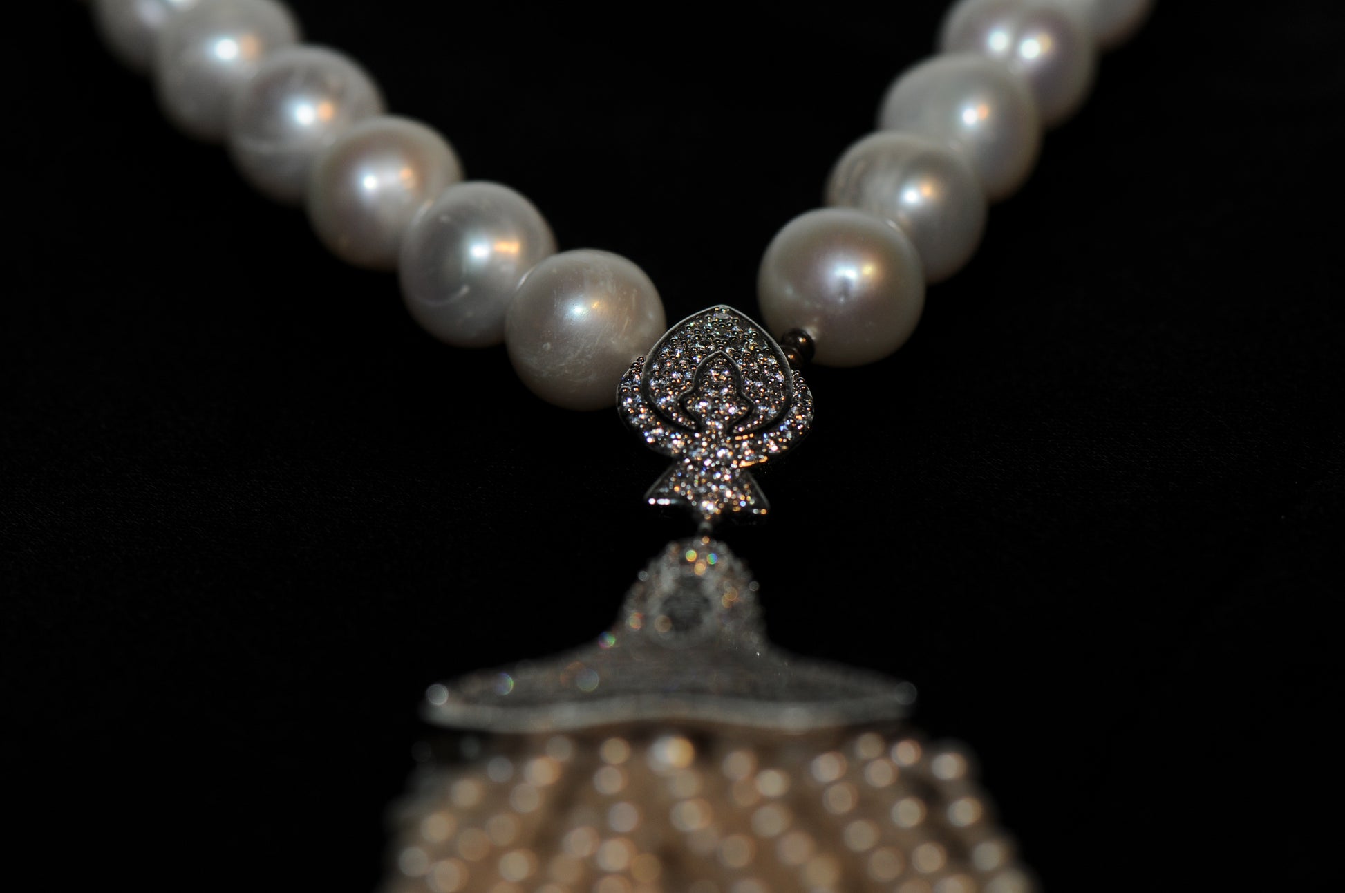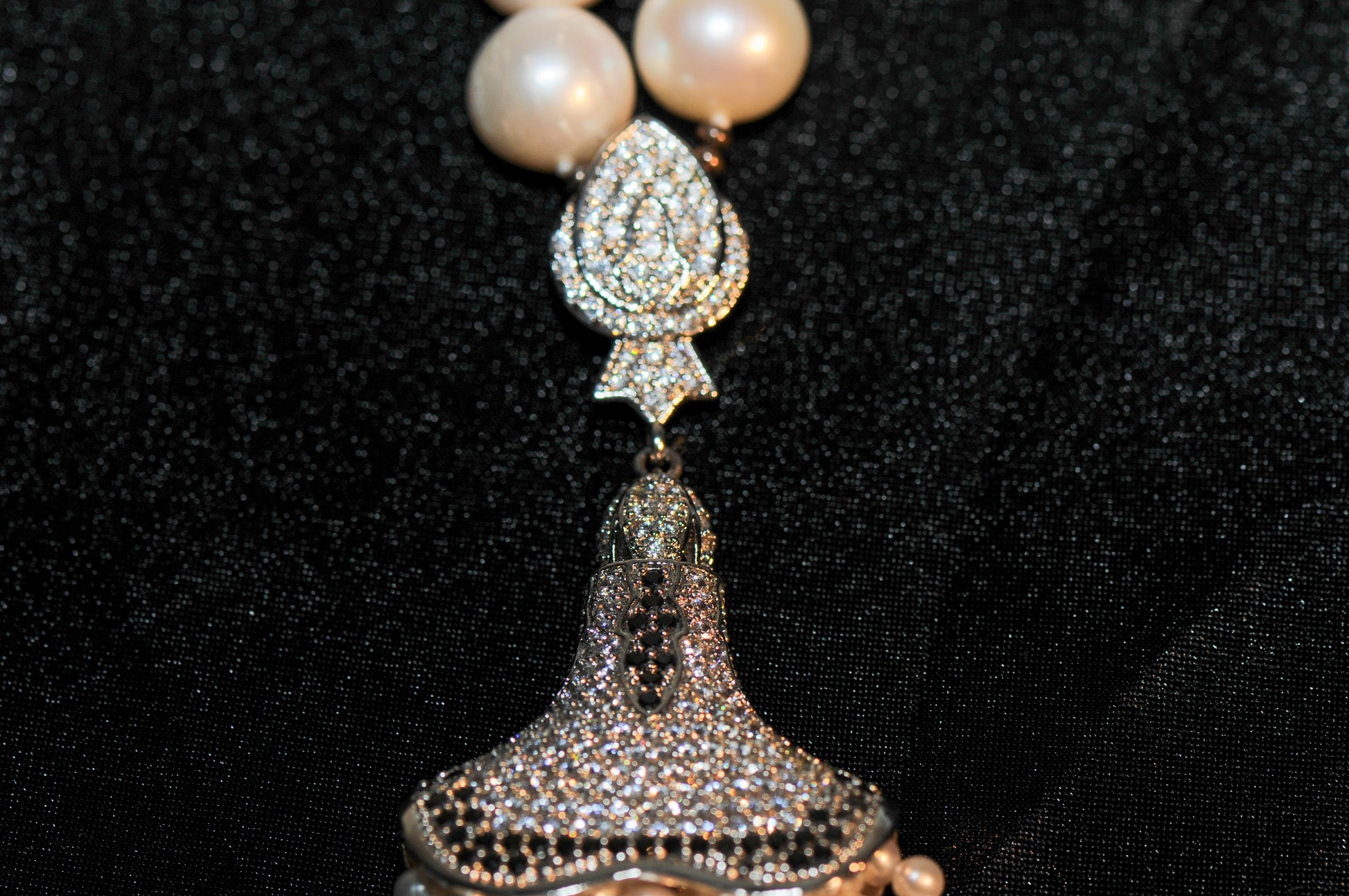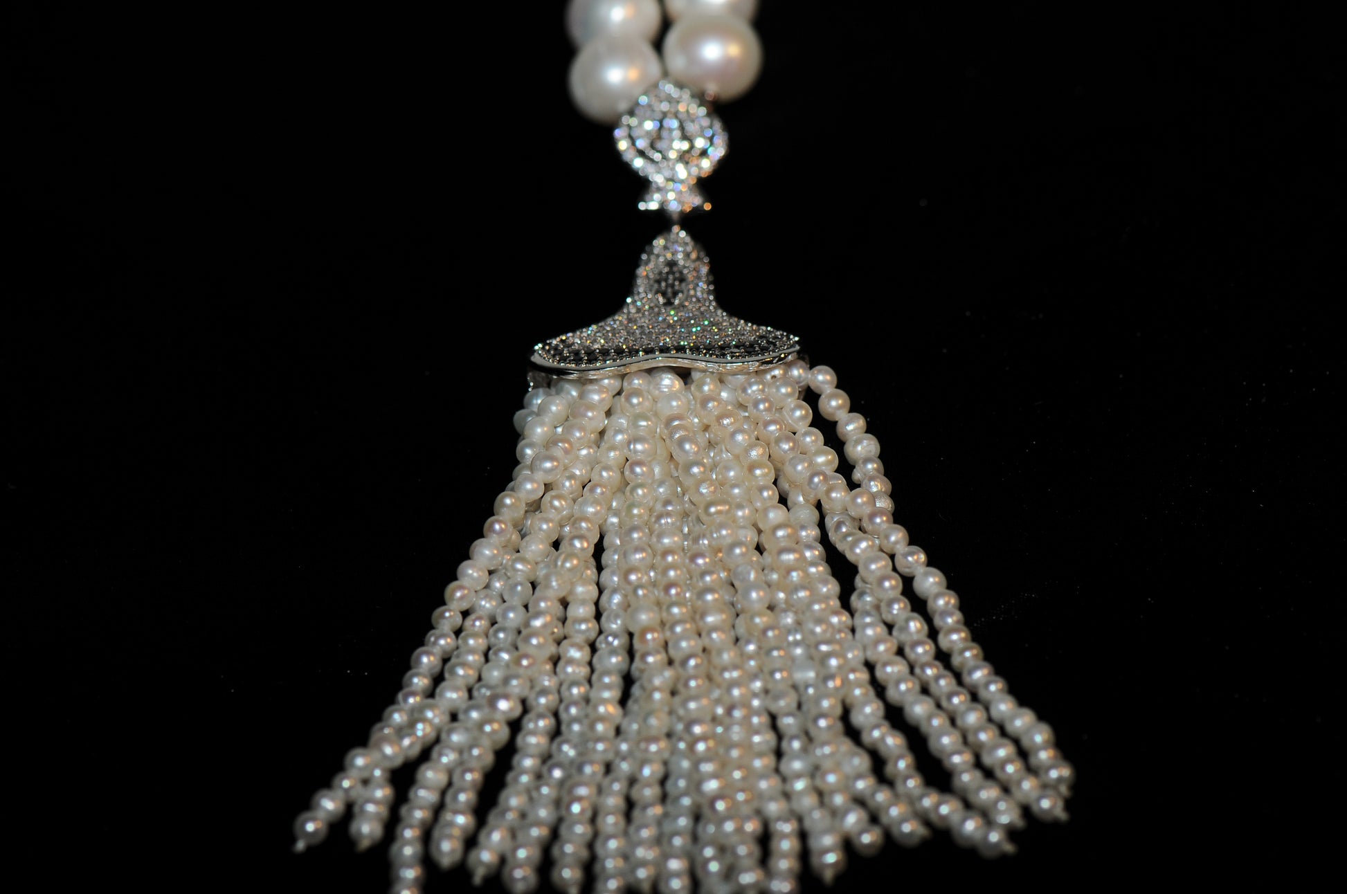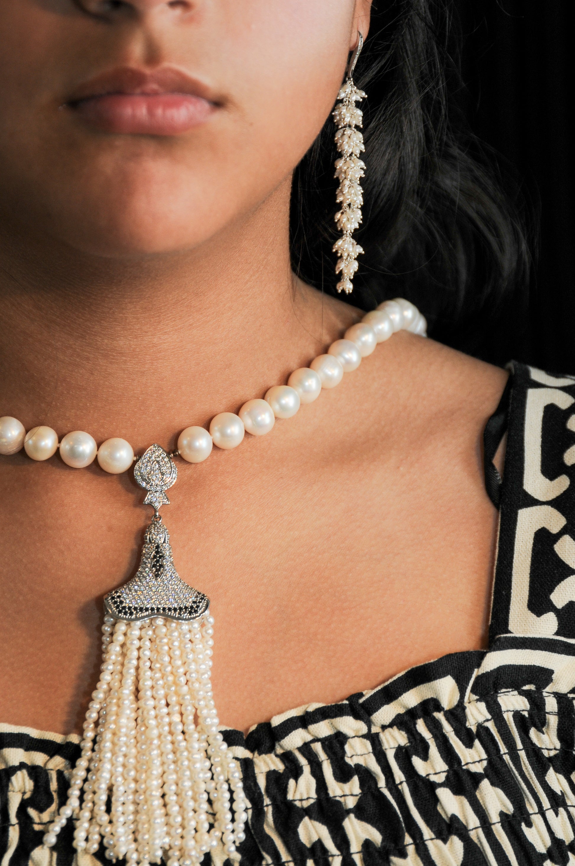 The one of a kind fresh water pearl necklace is knotted individually in silk thread, with a sterling silver clasp. A beautiful sterling silver zirconia pendant with pearl tassels. Handmade necklace using real pearls. 39 cm necklace